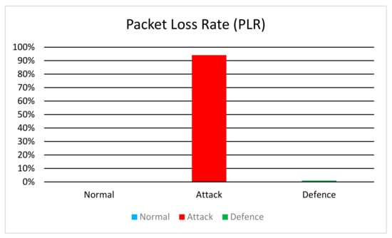 In the attack scenario, the PLR reaches 94.15%, indicating a high rate of packet loss due to the flooding attack. Conversely, in the Defense scenario, the PLR decreases significantly to 1.01%, demonstrating the successful mitigation of packet loss by the TDIP defense mechanism.