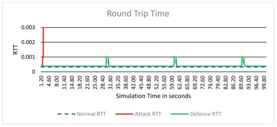 Upon activating the TDIP defense mechanism in the defense scenario, we observe a dynamic pattern in RTT behavior. Initially mirroring the RTT of the normal scenario, the RTT remains stable at 381 μs. However, at intervals of 30 s in simulation time, corresponding to IP address rotations enforced by the defense mechanism, we observe a temporary increase in RTT to around 1 ms, accompanied by a single packet loss. This increase in RTT and packet loss coincides with the IP address change, representing the time required for TCP connection re-establishment. Subsequently, the RTT returns to the baseline value of 381 μs, indicating restored communication stability.
