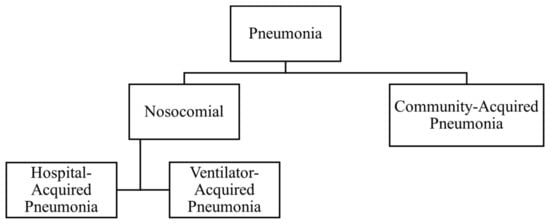 Pneumonia is an infection of the lower respiratory tract. Mackenzie and Chang defined pneumonia as an acute infection of the lung parenchyma by various pathogens, excluding the condition of bronchiolitis [5]. Pneumonia can be classified according to the severity of the disease, as well as the site where the infection was caught, as shown in Figure 1. Community-acquired pneumonia is defined as pneumonia caught outside the hospital [6]. Nosocomial infection refers to infection contracted in hospital settings; hence, nosocomial pneumonia is further divided into hospital-acquired pneumonia (HAP) and ventilator-acquired pneumonia (VAP). Pneumonia that develops 48 h after a patient has been hospitalized is HAP, whereas VAP is defined as pneumonia that develops 48 h after intubation [7].