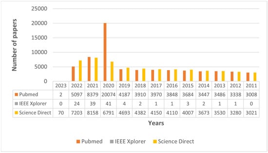 Later, the search was limited to only journal articles, and 119, 66,430, and 57,068 papers were found, respectively. Only two very relevant conference papers were included after careful consideration by the authors. The year-wise distribution of the research article is shown in Figure 2. The first 1000 and 10,000 articles could not be accessed via Science Direct and PubMed only, as per database restrictions. Nine hundred and fifty-two (952) duplicates were removed using EndNote Web 20