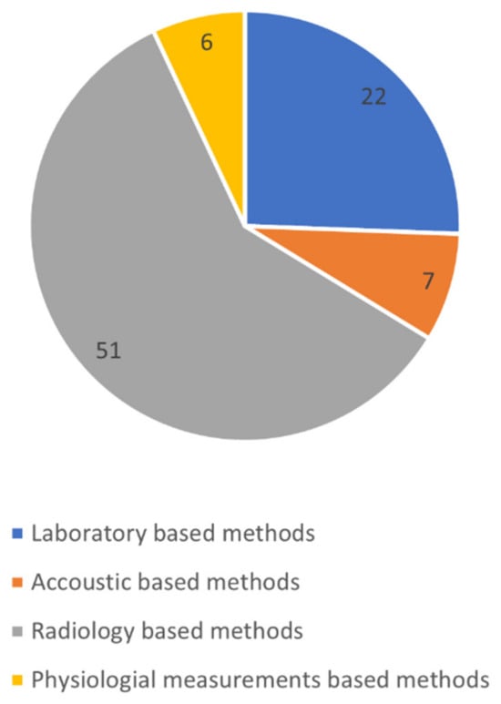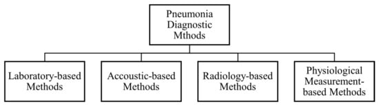As part of the review process, we categorized the pneumonia diagnostic methods into four classes, as shown in Figure 5. Each category is discussed in detail. Section 3.1 discusses laboratory-based diagnostic methods, Section 3.2 discusses acoustic- or chest-sound-based detection methods, Section 3.3 discusses imaging-based methods—within which CXR, CT and lung ultrasound methods are discussed individually—and finally, in Section 3.4, physiological-measurement-based methods are described. Additional papers are discussed in Section 3.5.