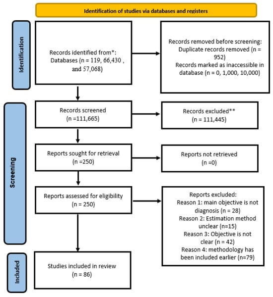 The articles were then shortlisted by manual scrutiny using an inclusion criterion, and 86 publications were selected for this study. Figure 3 shows the distribution of papers for each technique incorporated in the study. Figure 4 shows the PRISMA flow diagram for the selection of articles.