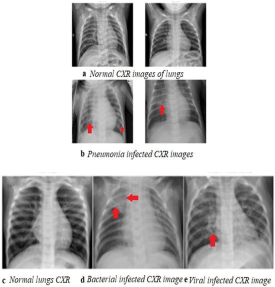 (a) Normal lung CXR images. (b) Pneumonia-infected lung CXR images taken from RSNA dataset. Bottom: CXR images of normal lungs, bacterial pneumonia, and viral pneumonia from left to right (c–e), taken from Kaggle, the open-access dataset [30,31].