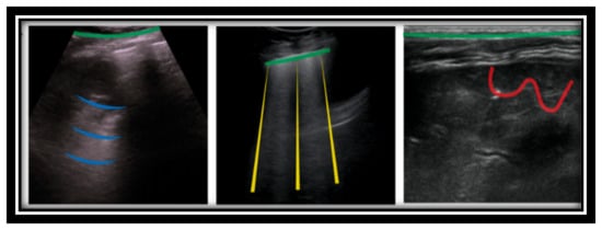 The key research articles presenting the lung ultrasound technique for diagnosing lower respiratory tract infection compared to CXR or CT scans are summarized in Table A5. The common pathological findings via LUS observed in the case of pneumonia are as follows: lines, hepatization, the shred sign, aerated bronchi, and hypoechoic parapneumonic effusion in the case of empyema [32]. Lung ultrasound images are shown in Figure 8. The pleura is seen as a hyperechoic horizontal line (green lines in Figure 8) [33]. The pleural line synchronizes with breathing, which is sometimes referred to as lung sliding. Additionally, below the pleural line, continuous hyperechoic horizontal lines appear as A lines (blue lines in Figure 8). Whenever aeration becomes compromised due to the accumulation of cells and fluids, the ultrasonic beam penetrates deeper into the lung, producing so-called B lines (comet-tail artefacts highlighted in yellow in Figure 8). The appearance of C lines indicates that lung consolidation has occurred as a result of an infectious pulmonary embolism, obstructive atelectasis, or a contusion of thoracic trauma (highlighted in red in Figure 8).