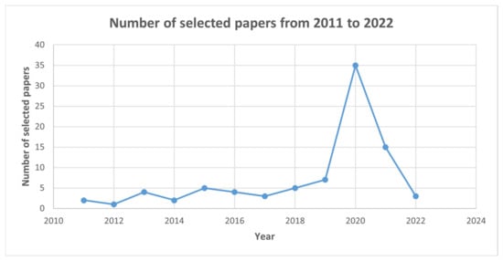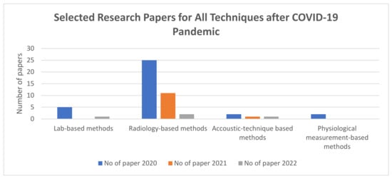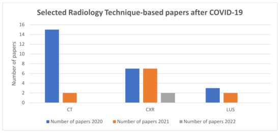 Figure 10 represents a technique-wise distribution of the selected papers for the year 2020 and the following years. During the years 2020, 2021, and 2022, there were 25, 11, and 2 selected papers that focused on radiology-based methods, respectively. This implies that most of the research during this period was geared towards radiology-based methods.
