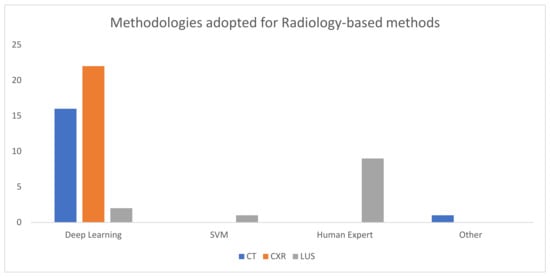 Finally, in Figure 12, we have attempted to visualize the different methods adopted to diagnose pneumonia using radiology-based methods, and it can be observed that almost 33 papers on CT scans and CXR were based on a deep learning method. This implies that advancements in deep learning, machine learning, and related fields are a primary reason for the influx of knowledge related to this field.