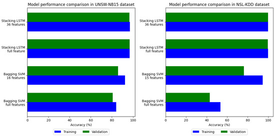 We evaluated overfitting by comparing model performance on the training and validation datasets. Figure 5 shows how well the models perform over the two datasets; Model 2 outperforms Model 1. Model 1 has a huge difference in accuracy between the training and validation datasets. Various parameters in LSTM can be adjusted to improve model performance. Simply increasing the number of hidden layers or units in a neural network does not necessarily result in overfitting. Insufficient layers and units can lead to low training and validation accuracy, while an excess can lead to high training accuracy but low testing accuracy. The ideal balance for a problem lies between these two extremes. In our research, we discovered that the architecture illustrated in Figure 4 provided good performance on both training and validation data. Therefore, it can be concluded that this architecture can generalize the model. On the UNSW-NB15 dataset, Model 1 exhibits an overfitting value of 7.55%, while on the NSL-KDD dataset, it demonstrates an overfitting value of 18.36%. Contrastingly, Model 2 showed overfitting values of 0.33% and 0.04% for the respective datasets. This indicates that Model 2 is highly suitable for detecting anomalies in data that have not been previously seen.