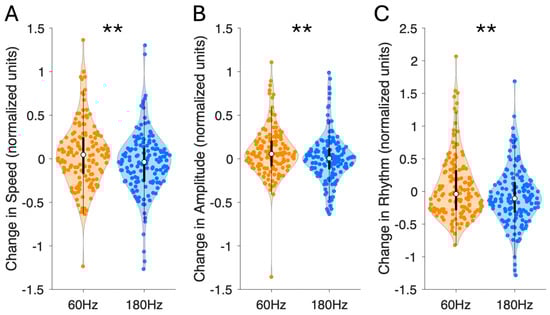 Change in hand movements’ (A) speed; (B) amplitude; and (C) rhythm following 60 Hz (orange) and 180 Hz (blue) subthalamic nucleus deep brain stimulation (n = 22 subjects; n = 150 60 Hz stimulation trials; n = 150 180 Hz stimulation trials). Lower values indicate bradykinesia symptom improvement. One point represents one stimulation trial. Black vertical line represents boxplot, with white circle representing sample median. ** represents significance at p < 0.05 level (paired-samples t-test).