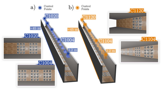 The deformation accumulated along the system, leading to a visible curvilinear distortion in the model. The configuration was adjusted by assuming that the cameras and markers were coplanar to address these potential deformations in such environments. Additionally, control points were strategically placed at both the beginning and end of the corridor, as shown in Figure 6. These control points provide a method with verifiable real-world data points essential for refining the reconstruction process.