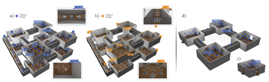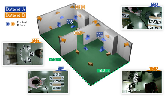 This was the first experiment with real data. In it, we aimed to find the position of the cameras placed in a real scenario comprised of two adjacent rooms (≈72 m2), as shown in Figure 5. For the experiment, we tested two different camera configurations (Dataset A and B), which are shown in the figure in blue and orange. For Dataset A (blue color), eight cameras were placed on the ceiling facing down, looking at a set of 25 markers of 21.7 cm placed on the floor. The cameras had a resolution of 1920 × 1080 pix, a focal length of ≈1108 pix, and a FOV of ≈84°. For Dataset B (orange color), a total of 16 cameras of the same type as in Dataset A were placed on the walls, looking at 16 markers with a marker size of 40 cm. Figure 5 also shows some of the images of the datasets.