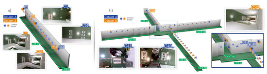 Corridor and complete floor datasets. Representations of camera positions and orientations are depicted using blue and orange pyramids. (a) Corridor datasets. (b) Complete floor datasets.