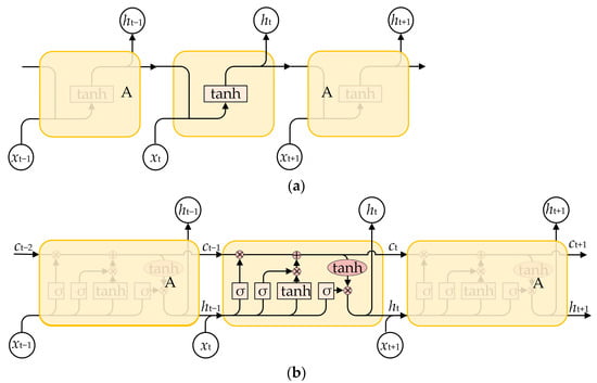 Structures of RNNs. (a) Vanilla RNN. (b) LSTM.