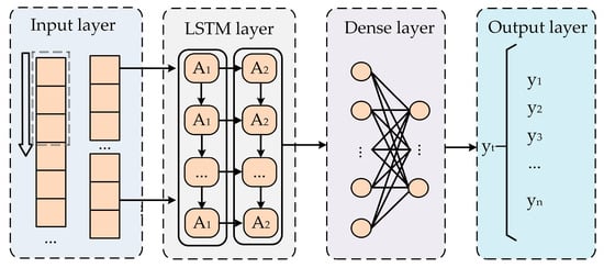 The proposed model structure is illustrated in Figure 2. The model comprises an input layer, two hidden LSTM layers, two dense layers with linear activation functions, and an output layer. The input layer normalizes the collected data and partitions it into training, validation, and test sets. The LSTM algorithm layers process the partitioned datasets, iteratively updating parameters through training. The dense layers connect each neuron from the input layer to every neuron in the output layer, enabling a full connection between the input and output layers. This connection method allows the model to better learn the relationship between inputs and outputs, thereby enhancing the model’s generalization capability.