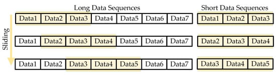 After the data sampling, the data becomes a continuous multidimensional time-series signal. The next step is to create and partition the dataset using the sliding window method. The sliding window method is a commonly used signal processing technique for time-series data or time-series signals. Its working principle is illustrated in Figure 3. The main idea is to define a fixed-size window marked as bold color in figure and slide it over the time-series signal to extract features within the window. The steps of the sliding window method are as follows: