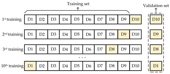 The generated short-sequence data are divided into training, validation, and testing sets according to certain proportions. The order of sample data within the dataset is randomly shuffled, ensuring the temporal relationships within the short sequences while reducing the temporal characteristics between sequences. This allows the model to more comprehensively learn the patterns of the data itself, enhancing its generalization ability and avoiding overfitting. Additionally, to better evaluate model performance and improve its generalization ability, this study adopts a 10-fold cross-validation approach, as shown in Figure 4. The dataset is equally divided into 10 mutually exclusive subsets, with one subset selected as the testing set each time and the remaining subsets used as the training set. The model is trained and evaluated 10 times repeatedly, and the average of the performance metrics from these 10 evaluations is calculated to obtain the final performance indicator of the model.