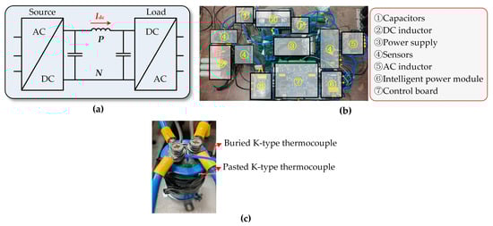 Schematic diagram of (a) circuit structure, (b) physical platform, and (c) capacitor under test with thermocouple.