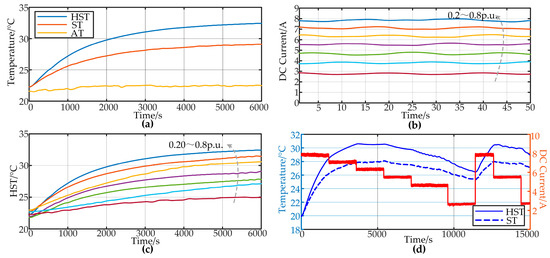 The first part involves temperature rise experiments under constant power conditions, simulating fixed loads such as ventilation and lighting. The capacitors undergo temperature rise experiments under different load depths. Constant loads are divided into seven groups, ranging from load depths of 0.2 to 0.8. One set of data in the data groups is shown in Figure 6a–c, including capacitor temperature data and DC current waveform. It can be observed that the rate of increase in HST and the final temperature both increase with the increase in load depth. This is because with a larger load, there is a greater amount of harmonic current contained in the output current of the converter. The capacitor endures more harmonic stress, resulting in more heat generation.