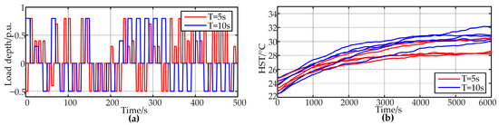 The third and fourth parts involve experiments under conditions of frequent and random power fluctuations, simulating high-frequency load variations such as those encountered in electric vehicles, resulting in more complex fluctuations in hotspot temperature. The load inverter randomly fluctuates within a predetermined power range at fixed intervals. The fluctuation range of the load power is from −0.5 to −0.3 and from 0.3 to 0.8. The fluctuation periods are divided into 5 s and 10 s, with each group consisting of twn experiments. Figure 7 provides temperature rise data for five sets of experiments for both 5 s and 10 s fluctuation periods, along with an example of random load depth on the load side. It can be observed that under these load conditions, the hotspot temperature exhibits more complex fluctuations, posing higher demands on the model.