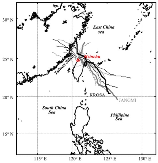 The tracks of selected historical typhoons (2006–2017) in Hsinchu station.