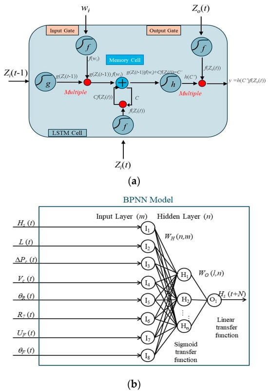 Artificial intelligence methods’ structure. (a) Backpropagation Neural Network; (b) Long Short-Term Memory.