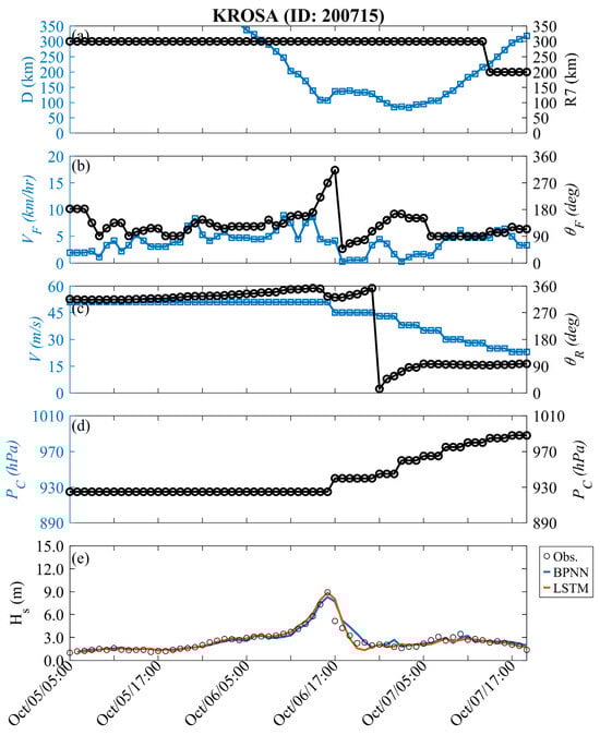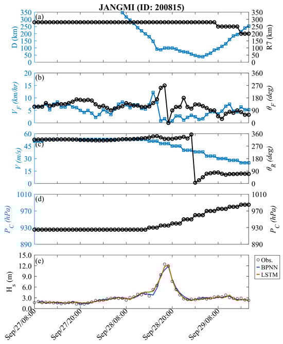 Figure 4 shows the time-series variation in typhoon factors for training events. In Figure 4a, the forward speed and angle of the typhoon are described; Figure 4b displays the relative relationship between the typhoon center and the data buoy, including distance and storm radius; Figure 4c illustrates the maximum wind speed and relative angle; Figure 4d represents the pressure deviation between the atmospheric pressure and the central of the typhoon. The variation in Hs during Typhoon Jangmi is also shown in Figure 4e. At first (see Figure 1), the typhoon was located approximately 600 km southeast of the Hsinchu data buoy (i.e., at a relative angle of approximately 300°). The central pressure of Typhoon Jangmi was 925 hPa (i.e., ΔP = 1013 − Pc = 88 hPa), with maximum wind speeds reaching 53 m/s and a storm radius of 280 km. When Typhoon Jangmi moved northwestward and approached Taiwan, its trajectory oscillated near the Central Mountain Range before turning to the northwest side (i.e., around 5:00 p.m. on 28 September 2008). During this period, the structure of Typhoon Jangmi was disrupted, leading to a decrease in the wind speed and pressure intensity at the typhoon center. When the distance between the typhoon center and the data buoy was less than the storm radius, the typhoon effects raised the wave height at the nearshore. When Typhoon Jangmi was approximately 87 km from the Hsinchu data buoy, typhoon waves exceeding 12 m were generated. Later, the typhoon waves gradually weakened. The LSTM (red line) and BPNN (blue line) methods exhibit considerable consistency with the observed values in the 1 h lead time prediction, with RMSE values of 0.343 and 0.423 m, CC values of 0.989 and 0.983, and MAE values of 0.257 and 0.291 m, respectively.