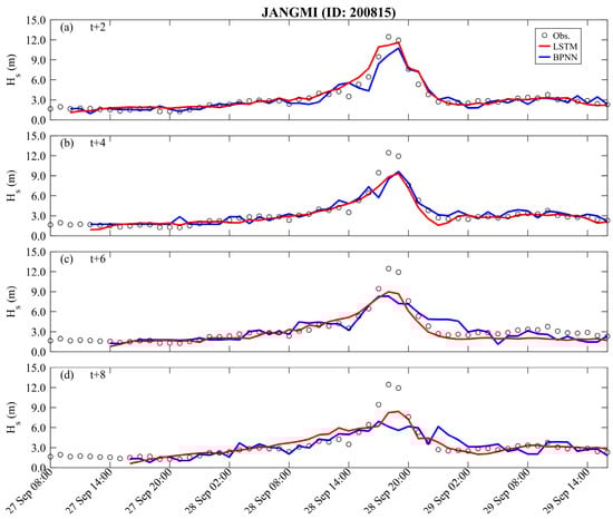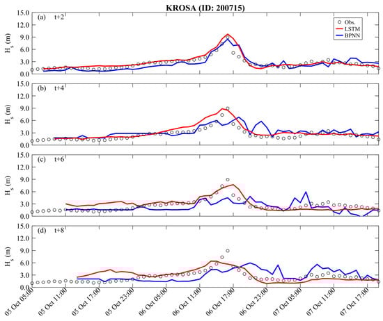 The long lead time predictions for the validation results (Typhoon Krosa) are presented in Figure 8 and Figure 9. The BPNN methods can effectively describe the variations in peak typhoon waves only at t + 2 h, with RMSE, CC, and MAE being 0.876 m, 0.864, and 0.719 m, respectively. The performance of LSTM is slightly better than BPNN (i.e., RMSE, CC, and MAE are 0.713 m, 0.940, and 0.448 m, respectively). As the prediction lead time increases, the prediction results of the BPNN method begin to deteriorate rapidly and even fail to capture the trend of temporal variations. In contrast, the LSTM method can capture the changes in peak typhoon waves until t + 6 h. When the lead prediction time reaches t + 8 h, the BPNN’s prediction of peak typhoon waves shows a delayed phenomenon (see the blue line in Figure 8d), with RMSE, CC, and MAE being 164.45 cm, 0.325, and 1.293 m, respectively. Although the LSTM method’s ability to describe peak values starts to decline (with the statistical metrics of RMSE, CC, and MAE being 1.251 m, 0.639, and 1.001 m, respectively), it still captures the trend of impending uplift just before the peak values. (See Table 3 and Table 4).