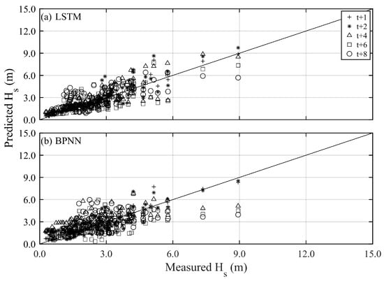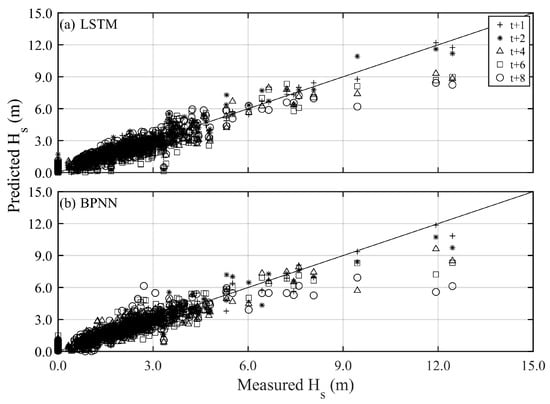Scatter plots of predicted and measured typhoon waves for all training events under different methods and lead times (various symbols): (a) LSTM and (b) BPNN.