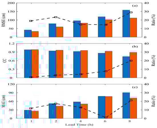 In both the training and validation events, the performance of the BPNN method decreases as the prediction lead time increases. For instance, from Figure 10a, it can be observed that RMSE reduces gradually from 0.423 m to 0.903 m. Similarly, in Figure 11a, for the validation event, RMSE drops significantly from 0.499 m at t + 1 h to 1.645 m at t + 8 h. Its accuracy is generally better at short prediction lead times (within t + 2 h), consistent with previous research findings [34,43,44]. The prediction model established using LSTM shows notable improvements compared to the BPNN model as the prediction lead time increases. In the training and validation events, these improvements range from 15% to 29% and 2% to 29%, respectively.