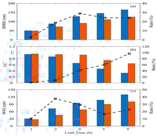 The performance (BPNN: blue; LSTM: red) and improvement (black line) of prediction in terms of (a) RMSE; (b) CC; and (c) MAE for all the validation events.