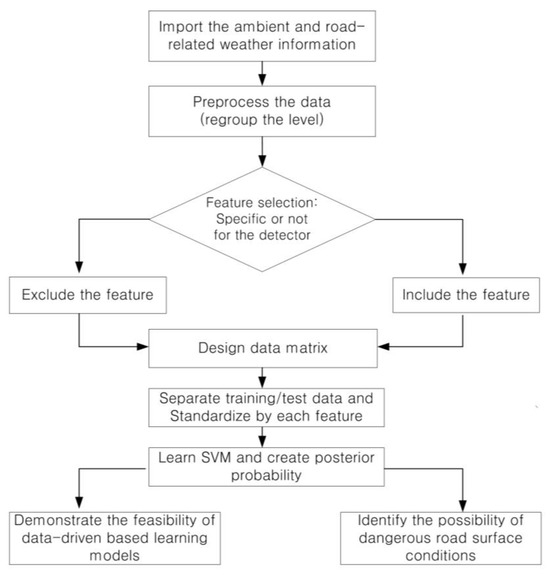 Most of the previous studies have focused on the classification of road surface conditions and pavement types based on image data or specific detectors. Furthermore, in the case of classification of road surface conditions associated with specific detectors, data related to vehicle behaviors (e.g., speed (Seo et al. [8])) may also be required. Therefore, this study differs from existing studies in that it builds a road surface condition classification model based on road surface and atmospheric weather information collected from low-cost roadside detectors or open sources, rather than applying a road surface condition classification model based on data collected from specific detectors. In addition, it is less affected by the road environment compared to models based on image data or data collected from expensive equipment.
