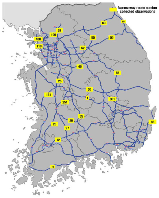 - Korea Expressway Corporation-Expressway Route Information. Available online: https://en.wikipedia.org/wiki/Expressways_in_South_Korea (accessed on 3 October 2023).
