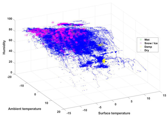 Scatter plot of humidity, ambient temperature, and road surface temperature.