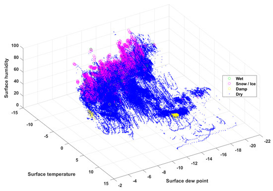 Figure 3 shows the data visualization between road surface temperature, ambient temperature, and ambient humidity with each road surface condition. The data for severe wet and snow/ice conditions are predominantly distributed at high humidity and low ambient and road surface temperatures. In particular, the snow/ice condition is distributed at higher humidity levels than the severe wet condition under the same ambient and road surface temperatures. Figure 4 shows the data visualization between road surface temperature, relative humidity of the road surface, and dew point on the road surface for each road surface condition. The snow/ice and severe wet conditions are distributed mostly in road surface regions with higher humidity and have a slightly higher dew point than that associated with dry conditions. Therefore, the weather features related to the road surface and the atmosphere show distinct trends for each road surface condition.