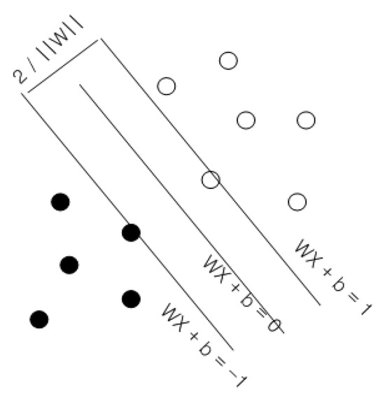 SVM is an algorithm that maximizes the margin (the distance between hyperplanes passing through each support vector) of the hyperplane that classifies two groups (1 and −1) (Figure 5). Furthermore, the hyperplane separates the data into two groups and satisfies the following condition:
