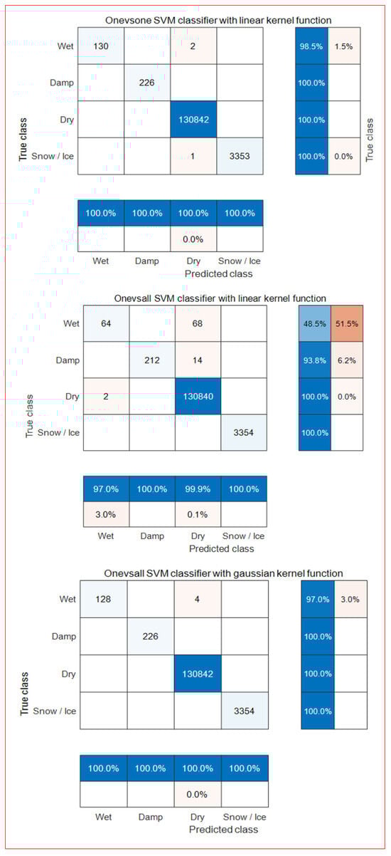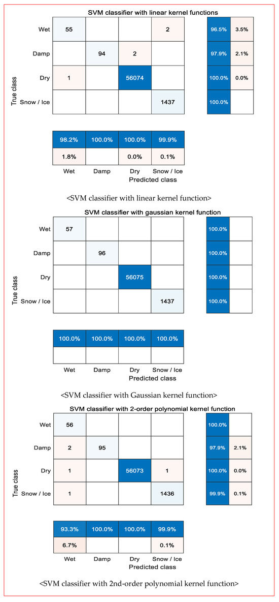 Figure 6 shows the accuracy of each predicted class and true class using the hyperparameters of the optimized kernel function (γ), C, and the weights of the hyperplane based on the training data for each type of learner. Here, the accuracy of each predicted class is the ratio of correctly predicted road surface conditions to the total number of predictions made, and this information is presented at the bottom. The accuracy of each true class is the ratio of correctly predicted road surface conditions to those that were not accurately predicted, and this information is presented on the far right.