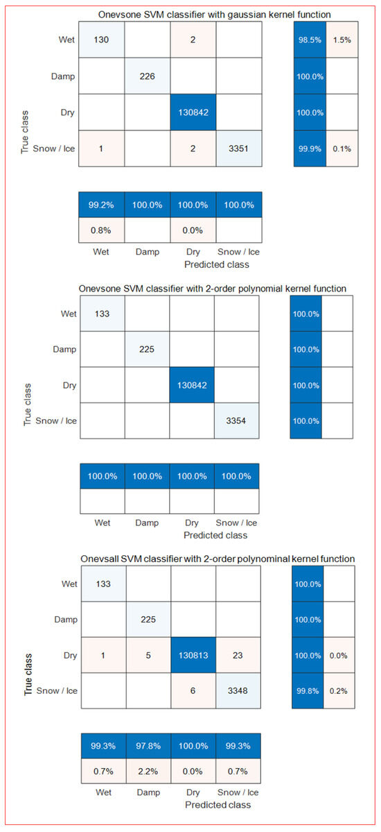 The classification errors of linear and nonlinear classifiers, excluding the one-vs-all linear learner, were below 3%, accurately classifying road surface conditions. The SVM classifier with a one-vs-one second-degree polynomial kernel function achieved the most accurate classification. Furthermore, the one-vs-one learning method was more accurate than the one-vs-all learning method in classification.