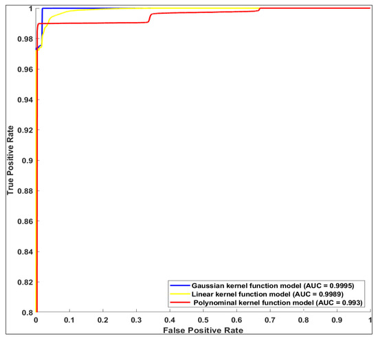 In addition to the confusion matrices, by plotting the receiver operating characteristic (ROC) curve with the area under the ROC curve (AUC), we evaluated the performances of the models on the test data. Figure 8 shows that the multi-classifier with a Gaussian kernel function was the best performance, followed by the linear kernel function and the polynomial kernel function.