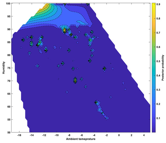 Posterior probability of a dangerous surface condition under ambient temperature and humidity.