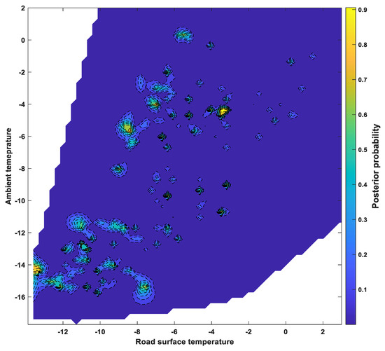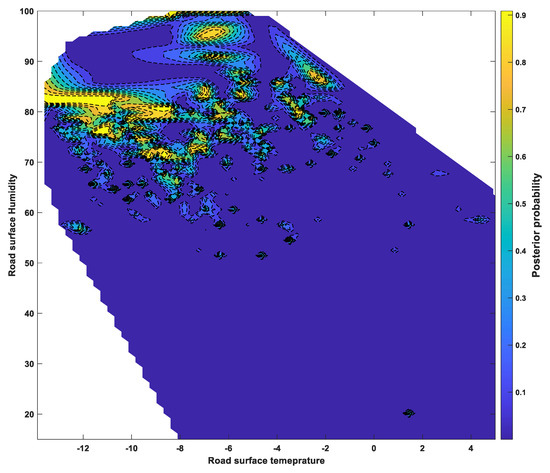 The classification scores determined by SVM using a one-vs-one Gaussian kernel function were applied to a sigmoid function to calculate the posterior probability of the occurrence of a “dangerous road surface condition,” which refers to severe wet, snowy, and or icy conditions and is directly related to traffic accidents. The posterior probabilities, calculated for each group, were summed to show the probability of a dangerous road surface condition under various environmental factors, as shown in Figure 9, Figure 10 and Figure 11. Figure 9 shows the ambient temperature and humidity, while Figure 10 shows the relationship between ambient temperature and road surface temperature. Figure 11 shows the probability of dangerous road surface conditions according to the road surface temperature and pavement moisture conditions.