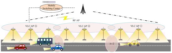 The RF link is assumed to be always available, because the coverage of an RF AP is much larger than that of a VLC AP and the RF signals can penetrate opaque obstruction and are less influenced by weather conditions. The mobile switching center is responsible for access selection and the handover process of the VMTs. The packets in the queue follow the first-in-first-out rule. Newly arrived packets are dropped when the buffer of the mobile switching center overflows.