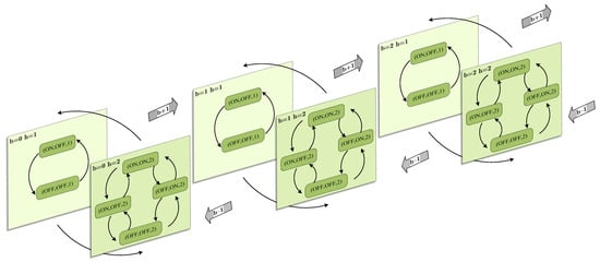 where s and represent the availability of the host VLC AP and the next VLC AP, respectively. An ON–OFF model is adopted to represent the intermittent VLC links, where ON and OFF represent available VLC links and unavailable links, respectively. Therefore, indicates the accessibility of VLC APs. The RF AP is assumed to always be available, thus not specified in the state space [14]. is a location sign, with indicating the VMT located in the overlapping area of two adjacent VLC APs as shown in Figure 1 and 1 indicating the non-overlapping regions. is the packet number in the queue, with B the network buffer size. represents the transmission mode, where 0 means the VTM is connected to the RF AP and 1 is the VLC AP.