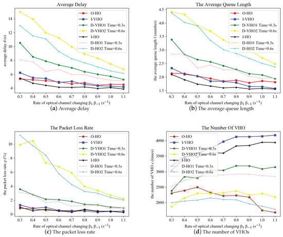 As shown in Figure 3, the four considered performance metrics were evaluated with respect to the link recovery rate of the VLC APs denoted by and , ranging from to (). The handover delays for HHO and VHO were set to and in the simulations. Larger values of and indicate a shorter VLC link blockage duration and a greater chance of link recovery. Therefore, the average delay time, the average queue length, and the packet loss rate of all handover schemes decreased remarkably.