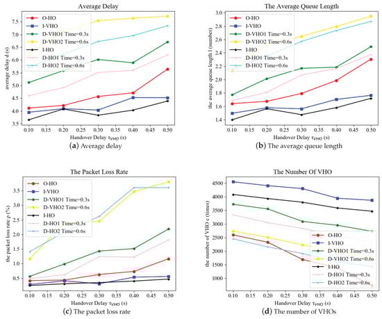 According to Figure 4a–c, the performance of the I-HO and I-VHO was the best in terms of the average delay, the average queue length, and the packet loss rate, and it was least degraded by the increasing VHO delay, while the performance of the Dwell handover schemes with dwell times 0.3 s and 0.6 s was roughly 1.5 times and 2 times worse when the vertical handover delay reached its maximum. However, the I-HO and I-VHO schemes carried out the handover process without waiting, thus resulting in the highest VHO numbers. Moreover, the VHO numbers of the I-VHO scheme were higher than that of I-HO because early HHO was not considered as an alternative option. The proposed O-HO scheme achieved a performance slightly inferior to the I-HO, with a greatly reduced number of VHOs that was almost the same as the Dwell HO with a dwell time of 0.6 s. This is because the O-HO took into consideration the early HHO choice in the handover decision process.