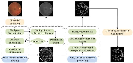 Considering that the labeling samples of retinal blood vessel images are few, there are uncertain noise and other factors. In this paper, the advantages of a grey system in uncertainty and a small sample problem are used to propose a novel single-sample retinal vessel segmentation method based on grey relational analysis. Figure 2 illustrates the flowchart of the proposed method. First of all, the noise is discrete, and the traditional grey correlation filtering algorithm cannot be used to unify all pixels; otherwise, the real pixel gray scale will be lost. In order to avoid false filtering, a novel noise-adaptive discrimination filtering algorithm based on grey relational analysis is proposed, and a good filtering effect is achieved. Secondly, a threshold segmentation model based on grey relational coefficients is proposed to improve the traditional grey correlation degree model, which avoids the pathological situation that the denominator may be zero in the Dunn correlation degree, and eliminates the normalization process in the traditional Dunn correlation degree calculation, which enhances the stability and executability of the model and achieves good operation results.