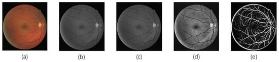 A Frangi filter is a filter used to enhance the structure of blood vessels, which is calculated based on the eigenvalues and eigenvectors of the Hessian matrix. Its main principle is to calculate the Hessian matrix on different scales and evaluate the similarity between the image region and the blood vessels by calculating the eigenvalues and eigenvectors. In addition, the Frangi filter also takes into account the orientation information of the feature vector because, in the vascular region, the direction of the feature vector is usually approximate to the direction of the blood vessel, while in the non-vascular region, the direction of the feature vector is more random. Therefore, by calculating the direction Angle of the feature vector, the Frangi filter can further improve the detection accuracy of the vascular structure. Figure 3 shows the enhanced image using the noise-adaptive discrimination filtering algorithm based on grey relational analysis, where it is observed that the blood vessels are distinguishable and the background blood vessel contrast is improved. Figure 3a–e display the middle image of fundus image preprocessing.