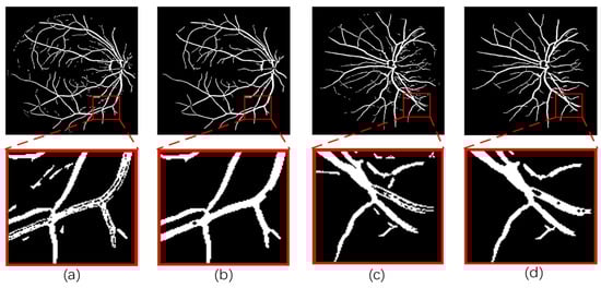 The final segmentation results are obtained through the post-processing stage using morphological manipulation. First, a disc-shaped structural element is created for closure operations to fill the void in the blood vessel and connect the broken blood vessel, thereby improving the vascular connectivity. Subsequently, connected regions with fewer than 70 pixels are eliminated from the identified blood vessel regions, effectively removing erroneously detected isolated pixels and assisting in the removal of noise or pseudo-targets. Figure 4 shows a comparison of images from the DRIVE dataset before and after post-processing. (a) and (c) are the images before post-processing, and (b) and (d) are the images after post-processing. By enlarging the detailed image before post-processing, it can be found that several error detection pixels appear together with blood vessel pixels, and a large number of gaps exist. The post-processing operation effectively connects the disconnected blood vessel pixels and removes the error pixels, greatly improving the accuracy and connectivity of blood vessel segmentation.