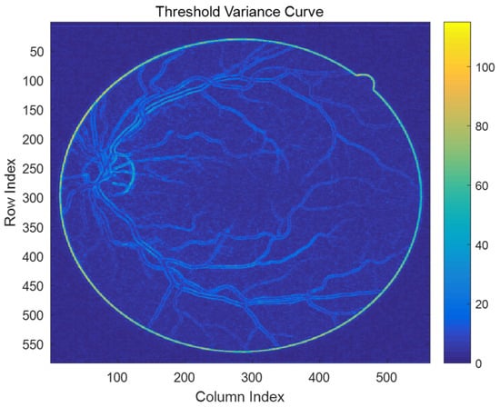 The experiment was carried out on Intel Core-i7 processor with 8 GB of RAM and a Windows 10 operating system. The algorithm was completed in a Matlab R2016a operating environment. The algorithm processes each image with an average of approximately 3.5 s for preprocessing, 0.39 s for segmentation, and 1.21 s for post-processing. Thus, the entire process typically completes in about 5 s per image, demonstrating high efficiency for supervised algorithms. Figure 5 depicts the threshold variation map of the noise-adaptive discrimination filtering algorithm based on grey relational analysis (NADF-GRA). Each pixel in the image corresponds to the intensity of threshold variation within a local window of the original image. Warmer colors like red indicate higher threshold variations, whereas cooler colors like blue indicate lower variations. Typically, regions with higher threshold variations require larger filter sizes to maintain edge sharpness, while regions with smaller variations can use smaller filters to preserve more detail. Effectively adjusting the threshold strategy to match the characteristics of retina images involves selecting appropriate thresholds.