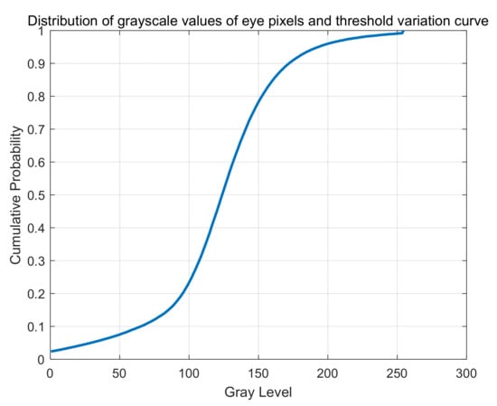Figure 6 shows the threshold variation curve of the threshold segmentation model based on grey relational analysis (TS-GRA). This curve illustrates the relationship between pixel grayscale levels and cumulative probability within the region of interest (retina). The horizontal axis represents grayscale levels from 0 to 255, and the vertical axis represents the cumulative probability, which denotes the percentage of pixels below each grayscale level. The optimal threshold typically resides at the steepest point of the curve, where the transition from foreground (retina) to background (surrounding area) is most pronounced. This point signifies a threshold that maximizes the segmentation accuracy between the eye and its surroundings, facilitating precise segmentation tasks.