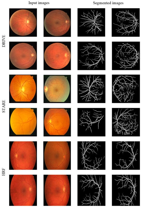 Figure 7 shows the visualized segmentation results of the proposed method on partial images from the DRIVE, STARE and HRF datasets.