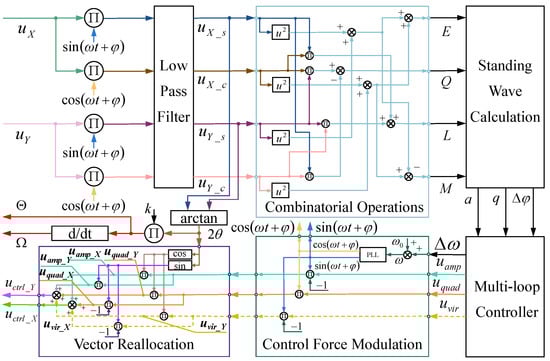 where and represent the demodulation quantities that encompass the amplitude of the main standing wave and the orthogonal wave, respectively; and represent the demodulation quantities that mainly encompass the phase of the demodulation reference signal; and are derived by multiplying the detection signals from Channel and Channel , respectively, with the cosine reference signal; and are derived by multiplying the detection signals from Channel and Channel , respectively, with the sine reference signal; and is the phase difference between the detection reference signal and the initial phase of the vibration. On this basis, the inputs for each controller in the multi-loop control of an RI-HRG can be articulated as: